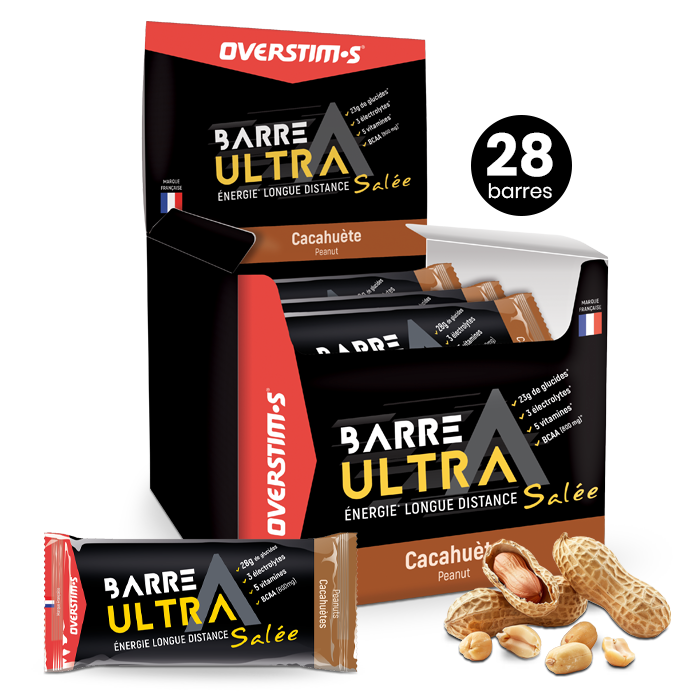La BARRE ULTRA SALÉE complète l'action des boissons énergétiques OVERSTIM.s et se consomme, pendant l'effort, à intervalles réguliers par petites portions.