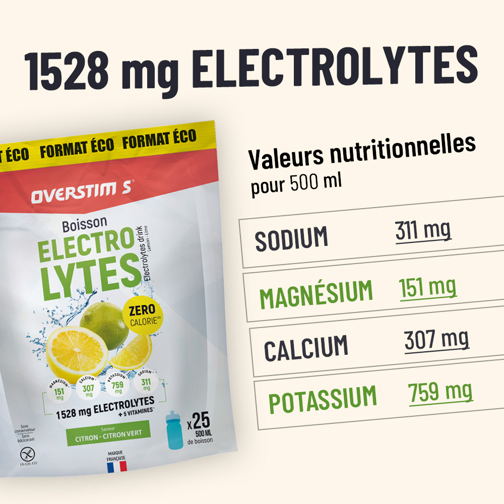 - 1528 mg d'électrolytes (sodium, calcium, magnésium, potassium)