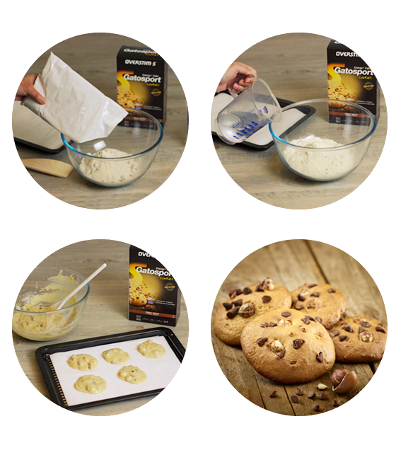 - Verser le contenu de la boîte de GATOSPORT COOKIES, ajouter 200 ml d'eau, mélanger le tout puis former 16 cookies sur du papier sulfurisé posé sur une plaque de four. Cuire au four 25 minutes à TH.6/7 (180/200°C).