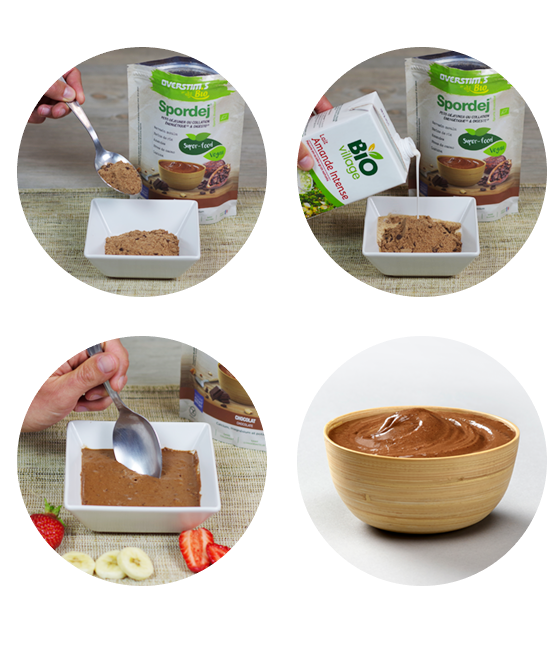 - Versez SPORDEJ BIO dans un bol. Ajoutez votre boisson végétale préférée (riz, amande, etc...) ou de l'eau en remuant doucement jusqu'à l'obtention d'une crème bien onctueuse. La consistance ne doit être ni liquide, ni compacte.