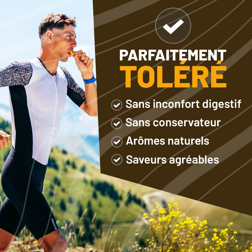 Le CAFEIN GEL se caractérise par une texture onctueuse et une composition sans conservateur et sans acidité, garantissant une excellente tolérance gastro-intestinale sans craindre d'inconfort digestif, même après plusieurs heures d'effort.