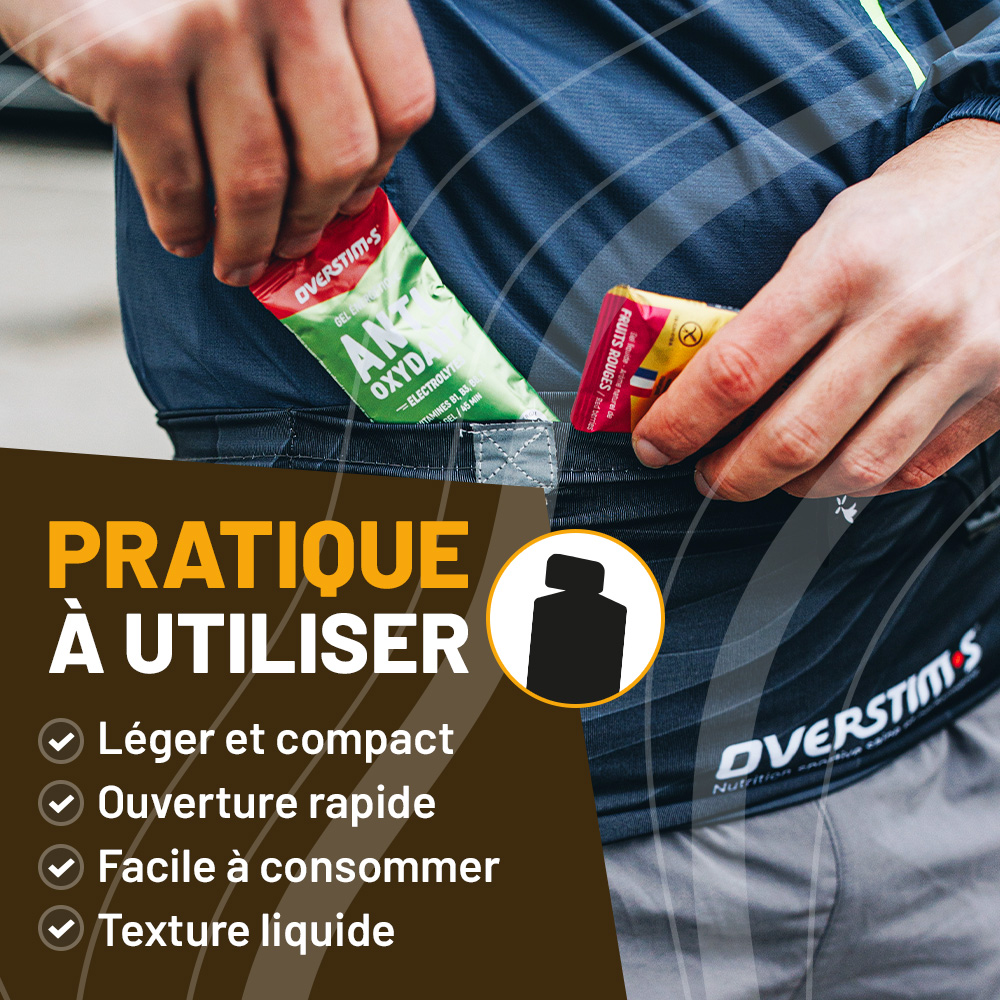 Boire 1 à 2 gorgées de boisson énergétique OVERSTIM.s ou d'eau après la consommation du gel.
